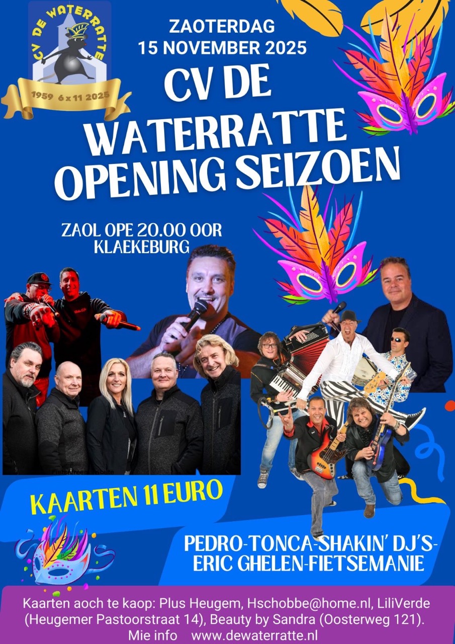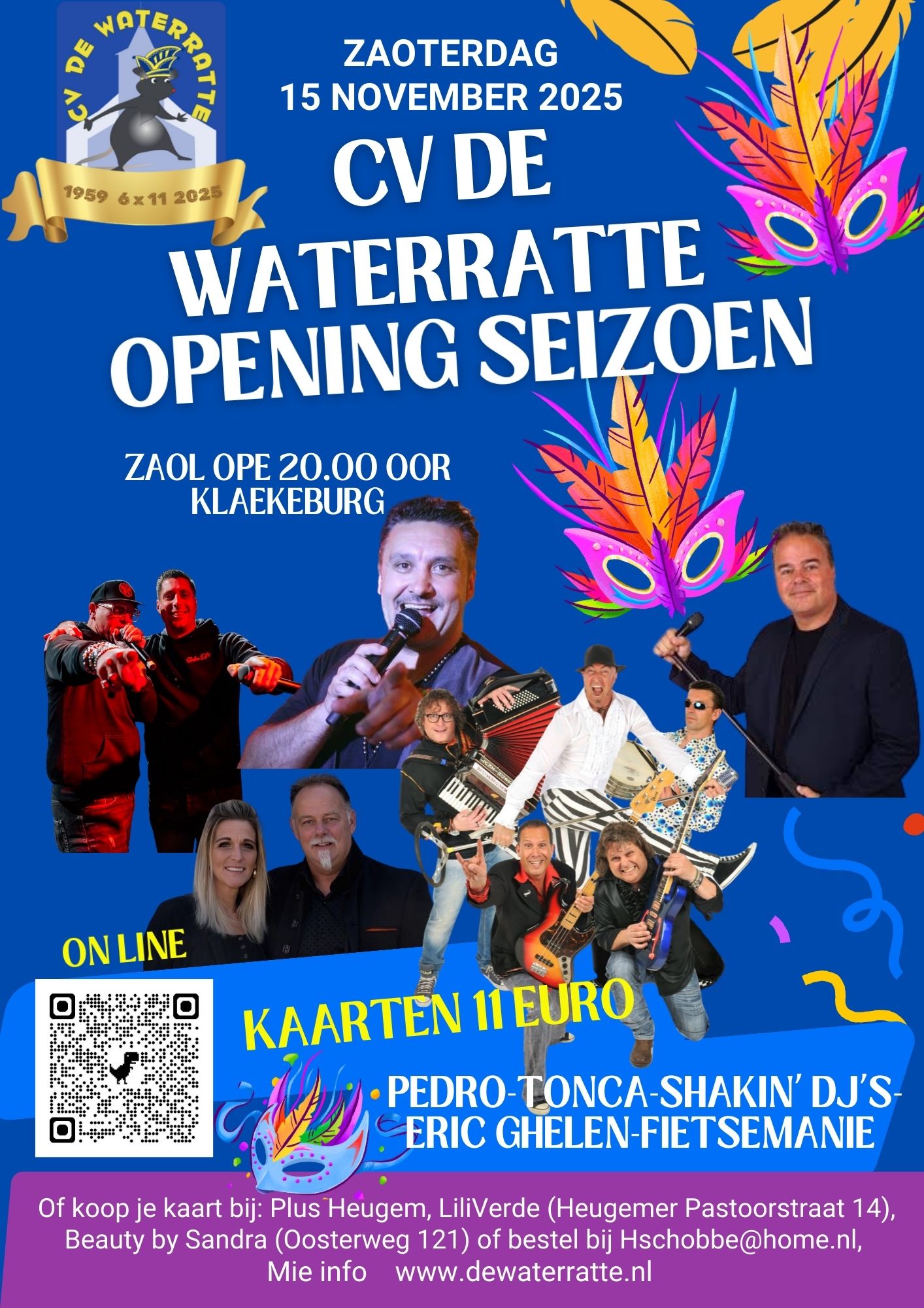 Zaterdag 18 november 2025 is het weer zover. Het Openingsbal van Cv de Waterratte in het jubileumseizoen 6 x 11. Om 20 uur gaan de deuren van de Klaekeburg open voor een geweldig programma. We starten dit een top programma met een veelziijdige artiest: Pedro. Vervolgens maken Tonca, Eric Ghelen, de Shakin’ Dj’s en Fietsemanie het feest compleet. Dit is weer een geweldige artiesten parade.
